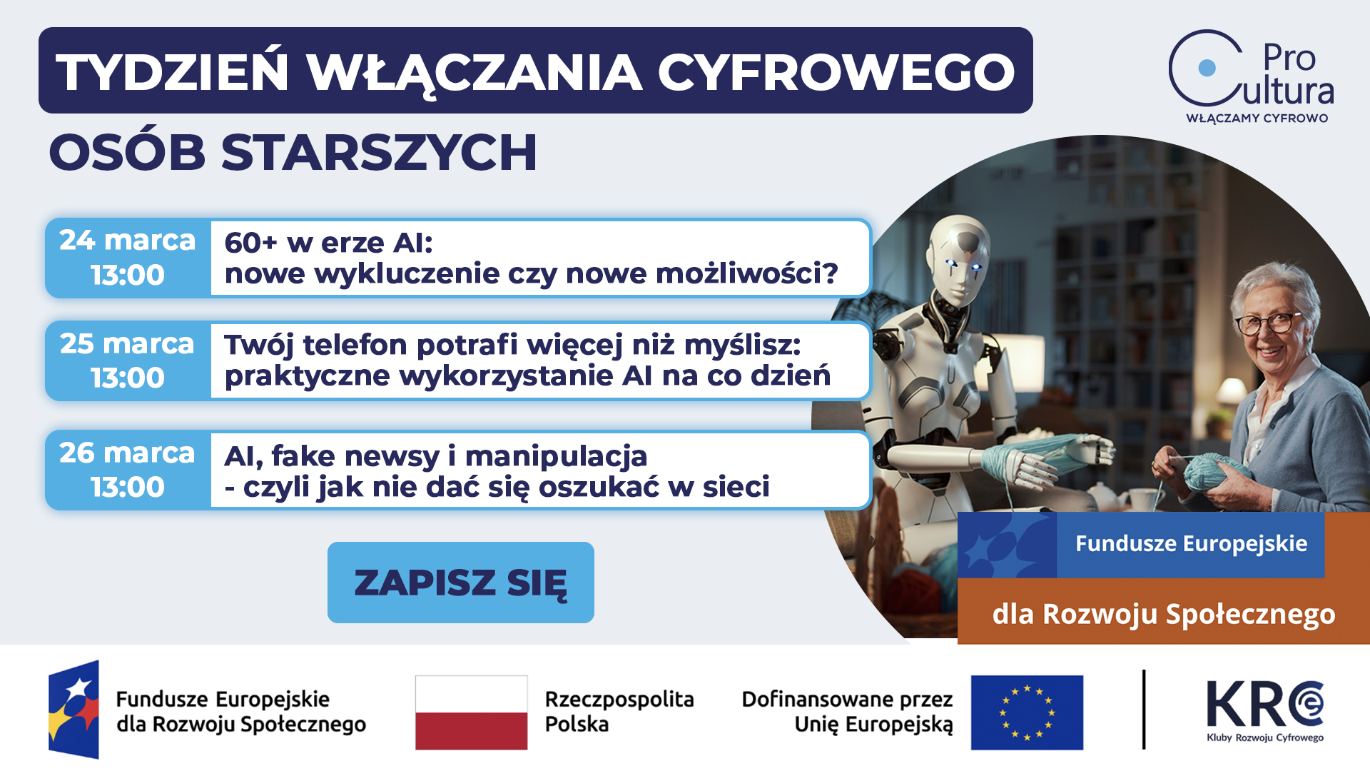 W dniach 24–26 marca 2026 r. Fundacja Pro Cultura organizuje Tydzień Włączania Cyfrowego Osób Starszych – cykl trzech bezpłatnych wydarzeń online poświęconych temu, jak sztuczna inteligencja wpływa na codzienne życie oraz jakie możliwości i wyzwania niesie dla osób 60+.