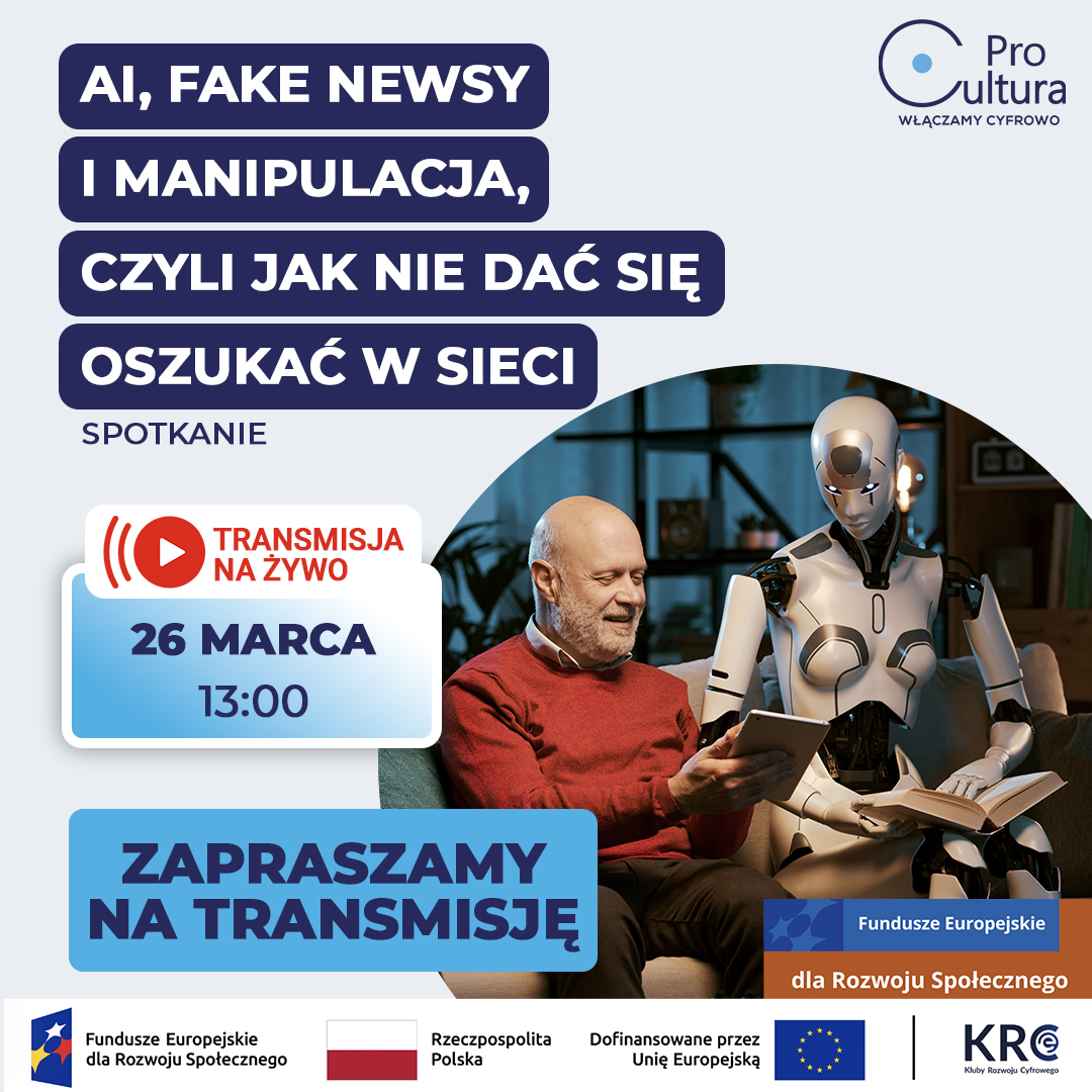 • 26 marca (13:00–14:30) – spotkanie „AI, fake newsy i manipulacja – czyli jak nie dać się oszukać w sieci”